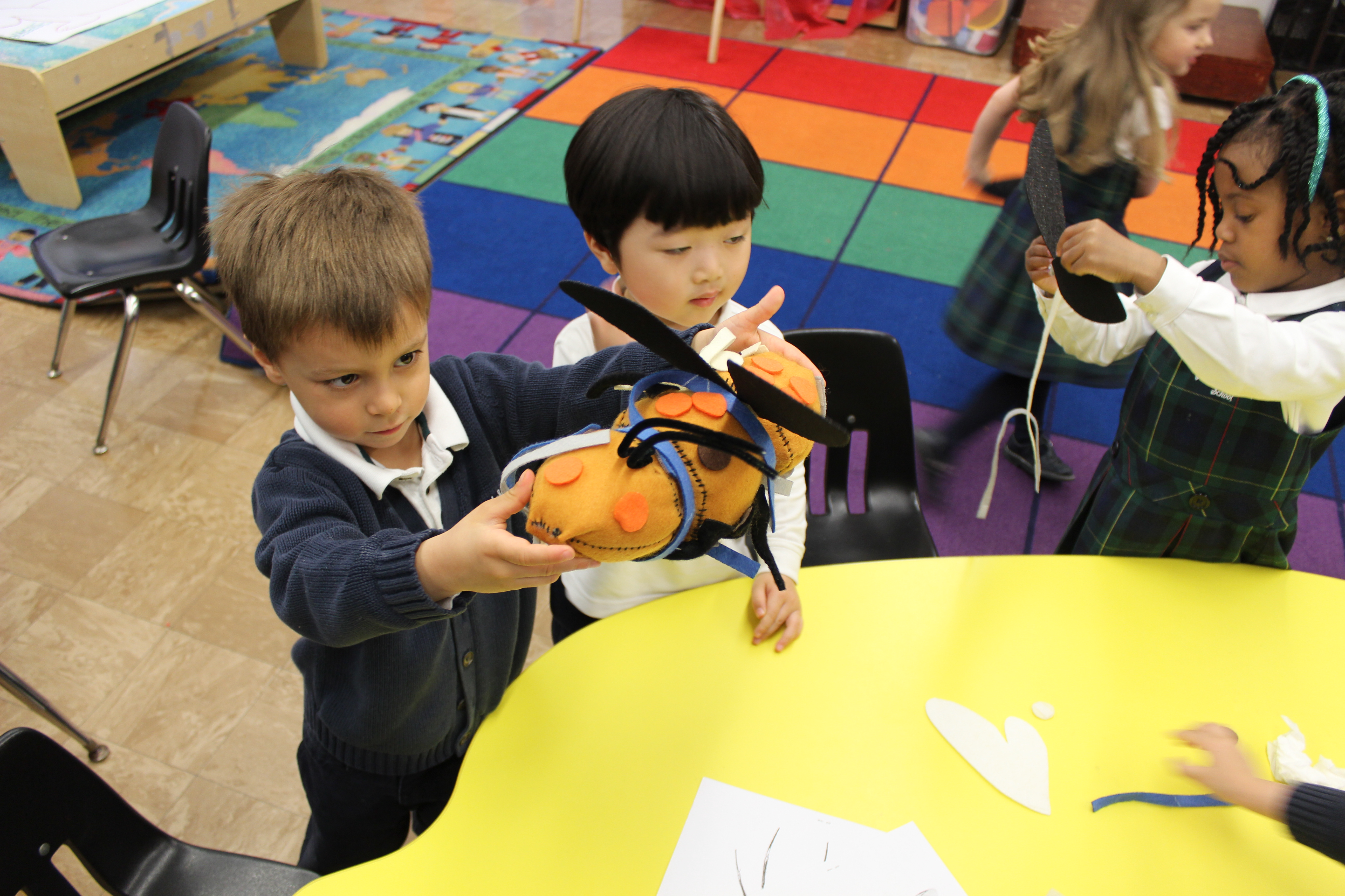 The Build-A-Bug lesson is designed to engage these young learners in close critical observation of these differences using simple guided observation techniques (counting, color recognition, size comparison), anchor these observations to as defining characteristics of different kinds of bugs (i.e. a butterfly’s wings are bigger than a bee’s) and provide them an opportunity to demonstrate that understanding through the creation of their own bug using a kit of modular, fabric, bug parts.