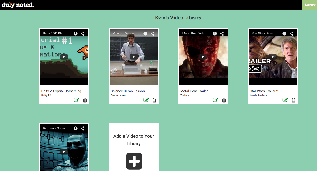 Screenshot of Library Page. Page contains videos the user has added to their library. To begin taking notes on a video, the user clicks the green pencil and paper icon. The black trashcan icon allows the user to delete the video. User can also add a new video to the library.