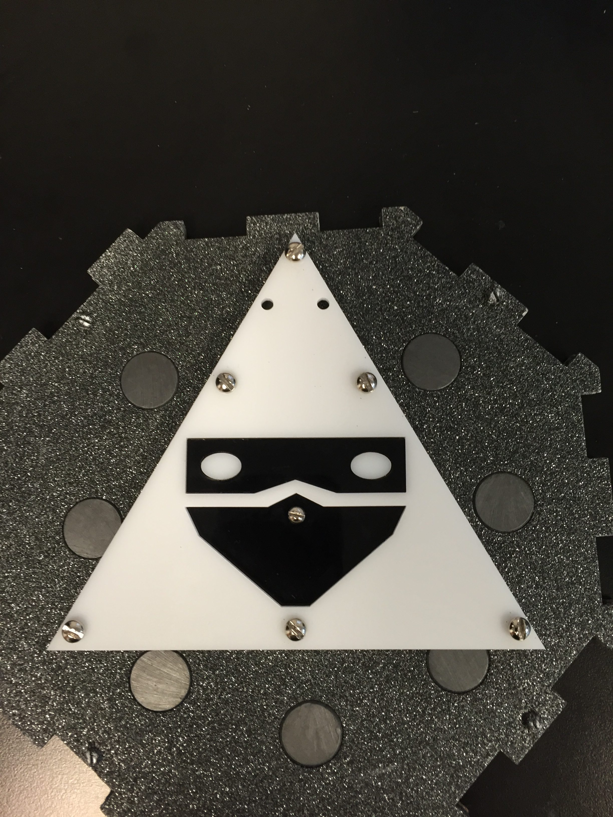 The board piece is built from painted plywood, and magnets. The board pieces are laser cut into interlocking octagon shapes. This design allows the players to design their own play area with infinite variations.