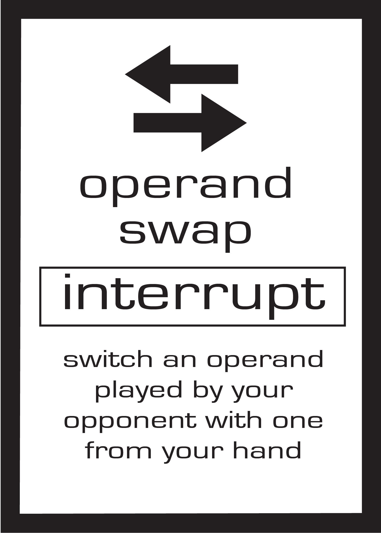 Interrupt cards are using by a player during their opponents turn. These cards allow the player to swap card their opponent played with ones from their hand. There are two types of interrupt cards, Operand Swap and Operator Swap.