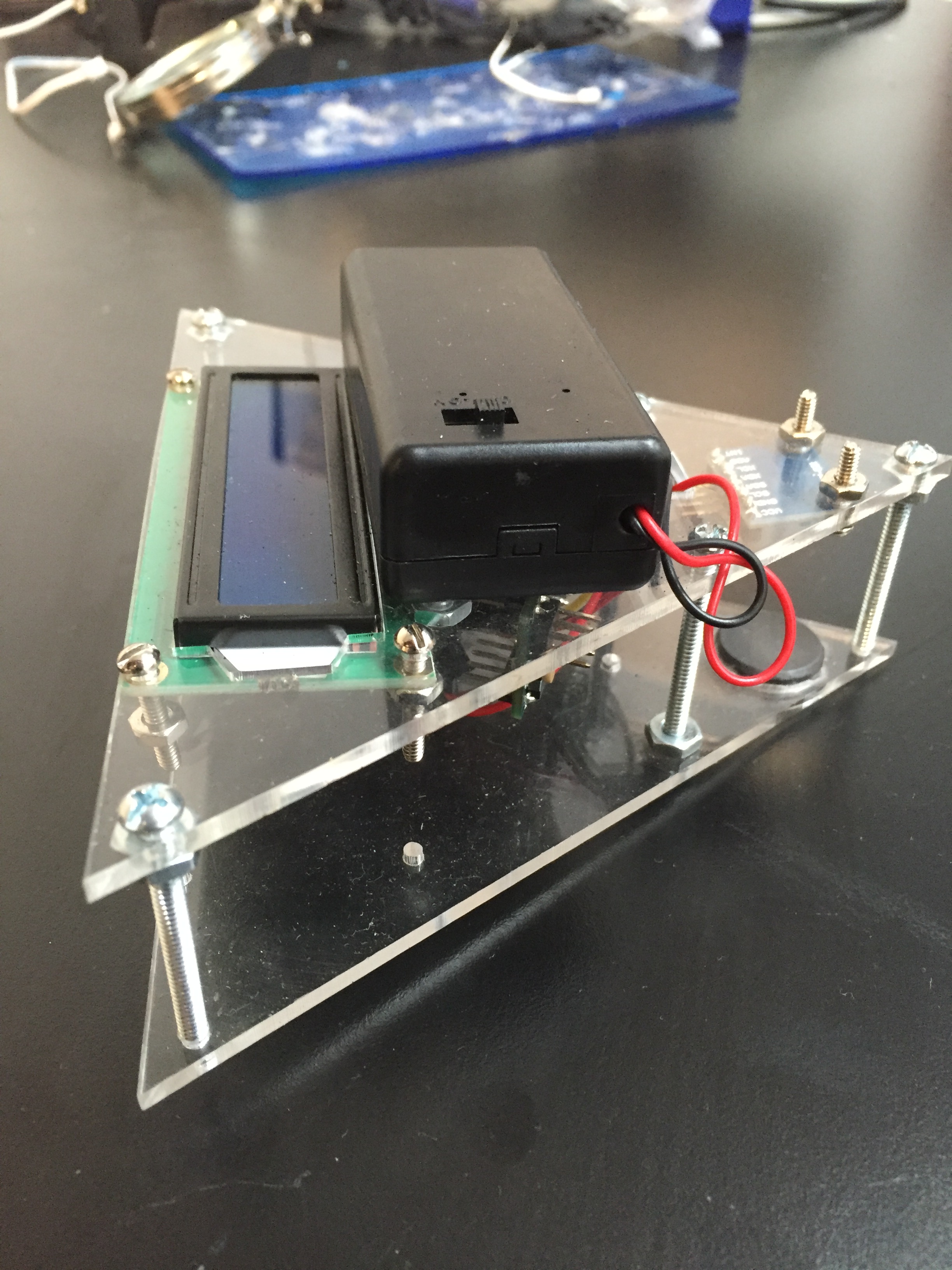 The player piece is built with clear acrylic and uses an Arduino Micro, LCD, Gyroscope/Accelerometer, and magnets. When the player piece is placed on the board piece, and rotated, the player piece displays its rotational position in degrees.